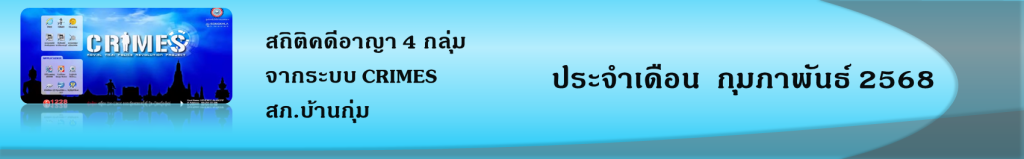 • ข้อมูลผลการดำเนินงานในเชิงสถิติด้านคดีอาญา 4 กลุ่มตามระบบ CRIMES เดือน ก.พ.68 ในรูปแบบไฟล์ Excel   คลิ๊กดูที่นี่