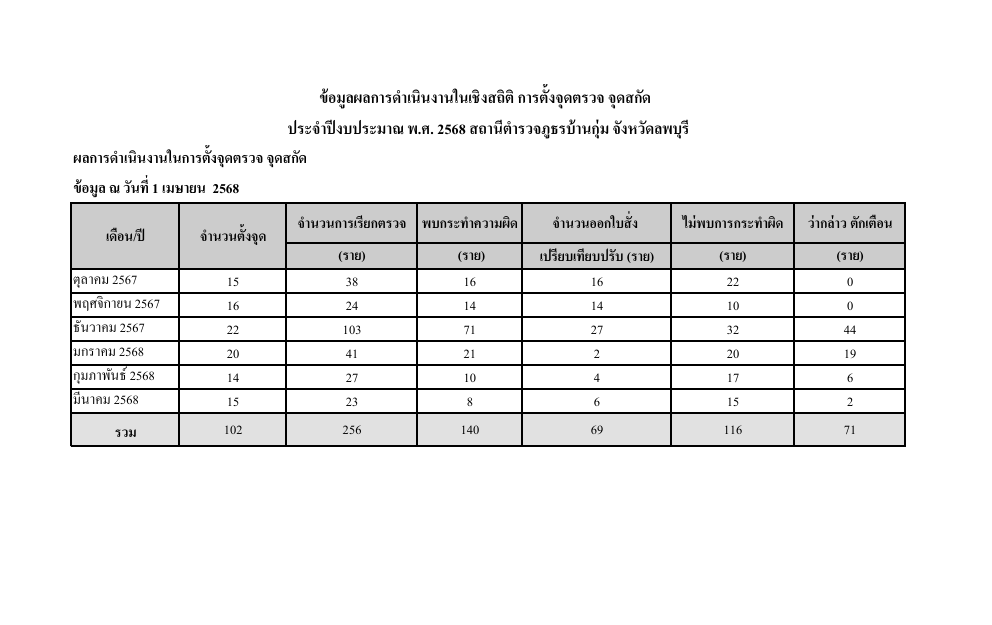 ข้อมูลผลการดำเนินงานเชิงสถิในการตั้งจุดตรวจ จุดสกัด 6 เดือนแรก